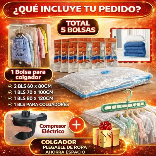Combo Guarda Ordena y Ahorra Espacio - Pack 5 Bolsas al vacío para ropa incluye Compresor Electrico